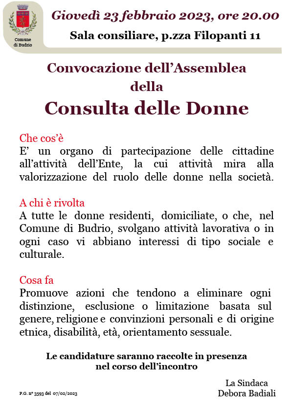Convocazione dell’Assemblea della Consulta delle Donne giovedì 23 febbraio alle 20.00 presso la Sala Consiliare, piazza Filopanti n. 11