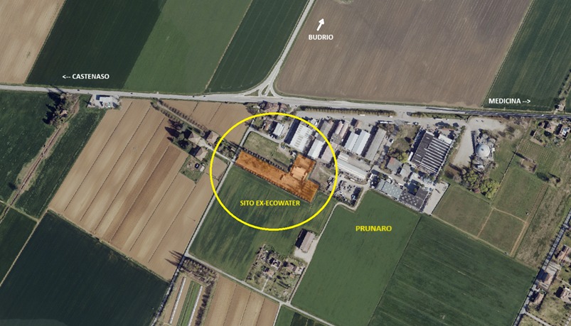 Nella foto aerea è evidenziato il sito ex-EcoWater che si trova nella zona artigianale di Prunaro, lungo la San Vitale. Una lunga storia durata più di venti anni ha caratterizzato quest’area dove nacque un impianto che inizialmente doveva trattare solo i reflui del limitrofo laboratorio di macelleria, ma che presto si trasformò in quello che doveva essere un complesso per il trattamento di rifiuti industriali di vario tipo.
