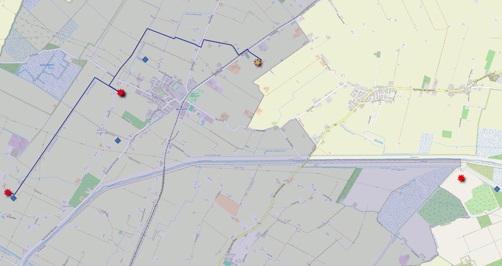 Le teste dei pozzi sono rappresentate con delle stelline rosse, mentre con dei rombi azzurri sono indicate le posizioni dei punti che le trivelle raggiungeranno in profondità (la trivellazione può seguire anche traiettorie non verticali). Dalla piazzola di Ronchi partiranno due trivellazioni, una verso nord e una verso sud.